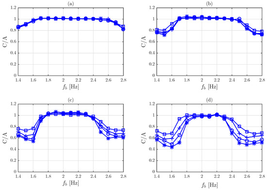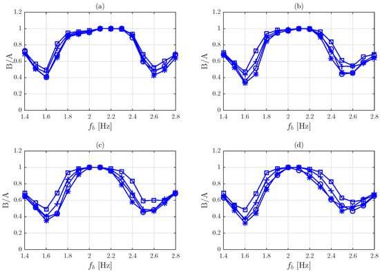 Response spectra of approach A. (a): m, (b): m, (c): m, (d): m. Marks: *: , ∘: , +: and □: .