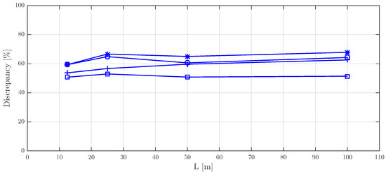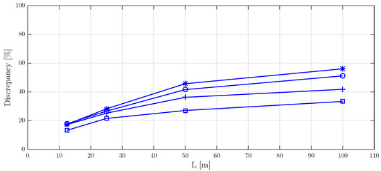 Maximum discrepancy between spectra C and A versus footbridge length, L. Marks: *: , ∘: , +: and □: .