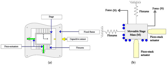 As shown in Figure 1a, the axis of the piezo-driven stage is equipped with a capacitive sensor for position measurement. The two axes (x and y) are driven by piezo stack flexure-based actuators. Each actuator is capable of generating 40 m of motion along each axis with the aid of flexures.