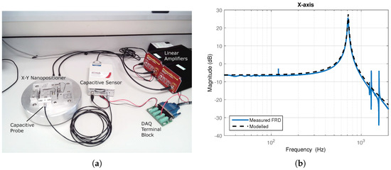 (a) A two-axis serial-kinematic nanopositioning platform with a range of 40 m driven by two PiezoDrive 200 V linear voltage amplifiers, with position measured by capacitive sensor; (b) comparison of the measured magnitude response of the stage axis (solid blue) and that of the derived second-order model (dashed black).