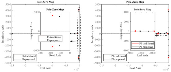 Comparison of the pole and zero locations for the traditional and the proposed control methods. Insets show zoomed-in areas for clarity.