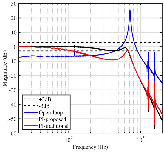 Figure 7 shows the open- and closed-loop frequency response obtained experimentally for the traditional and proposed methods. It can be observed that significant improvement in the closed-loop bandwidth was achieved. This improvement was so effective at capturing the frequencies that it formed the triangular wave.