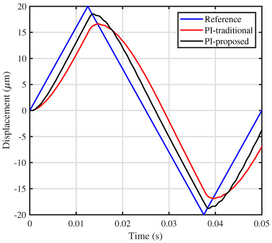 In order to inspect the obtained bandwidth in the time-domain and in the presence of disturbances such as hysteresis, the time-domain tracking is plotted in Figure 8 for a 20-Hz triangular reference. It can be seen that a significant improvement in tracking performance was achieved using the proposed method.