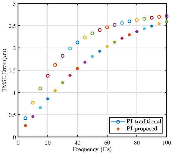 Using the traditional method for the selected value of = , in order to guarantee stability and provide a reasonable stability margin, the value of the tracking gain was chosen to be around 1300. Thus, the maximum allowable value of the tracking gain was 1300. As shown in Table 1, the achievable bandwidth using the traditional method was limited to around 110 Hz. As mentioned above, the selected value of the PI zero to cancel exactly the pole of the IRC restricted the gain margin. On the other hand, placing the PI zero at a significant distance from the IRC pole increased the gain margin, and as a result, a higher value of the tracking gain can be chosen. Therefore, improvement in positioning bandwidth was obtained around 668 Hz, as is clear in Table 1. The table presents the achievable bandwidth such that the closed-loop response must not deviate from ±3 dB. Error was reduced using the proposed method as a result of the higher bandwidth obtained.
