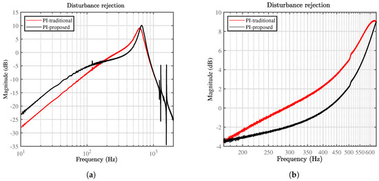 Disturbance rejection profile for the proposed and traditional method: (a) over the entire bandwidth; (b) over the bandwidth of interest.