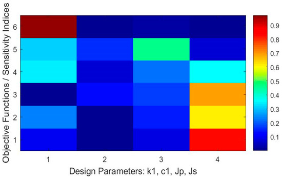 The solution is presented in Figure 15 by mapping the design parameters and the values of the total sensitivity indices of the objective Functions (44).