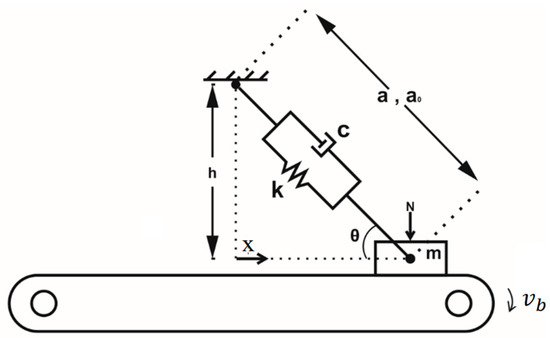 The model consists of a mass sliding on a moving belt with constant velocity () and is supported by a spring and dashpot that rotate freely as shown in Figure 1. In addition, a constant applied normal load () is chosen large enough so as to prevent the mass from loss of contact with the belt. An exponential decaying function which accounts for the Stribeck effect is assumed to define the coefficient of friction,. Moreover, the angle between the spring-dashpot and the direction of sliding is denoted , the free length of spring is and the pre-compression length of spring in the vertical position (). The condition is necessary so that the spring in the vertical position is compressed. It should be noted that the contact force varies as mass oscillates on the belt due to normal components of elastic and viscous forces. In this article, the right-side refers to the positive position of the mass, i.e., , and the left-side implies negative position of the mass.