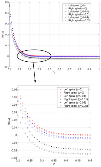 where stands for the determinant of the argument, is the eigenvalue at the corresponding equilibrium point and is the identity matrix. The real part of the eigenvalue determines the stability of the corresponding equilibrium point. Figure 3 illustrates the variation of the real parts of the eigenvalues versus belt velocity for three damping ratios. As the belt velocity increased, the positive real part of the eigenvalues started from all being positive and decreased until most crossed the zero value and entered the negative range. Only for the undamped system () the real part of the eigenvalues merged at . Adding viscous damping to the system, made the spirals stable after a critical belt velocity was exceeded. It was interesting to note that the spiral located on the right side () became stable sooner than the one on the left. Therefore, three different stability conditions for spirals can occur: (1) two spiral sources at the relatively low range of the belt velocity, (2) a spiral source on the left along with a spiral sink on the right, and finally, (3) two spiral sinks for relatively high belt speed. The specific range of the belt velocity depends on the damping coefficient as depicted in Figure 3. The way the stability of the spirals affected steady-state response of the oscillator will be discussed later in this paper.