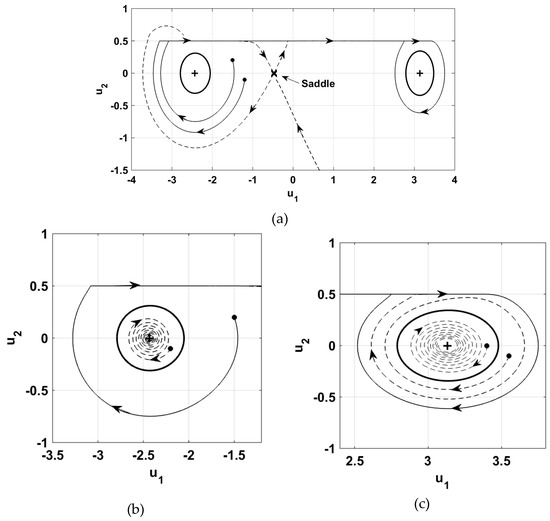 Further increase in belt speed yielded two spiral sinks flanking the saddle as suggested by Figure 3. Figure 7a depicts the phase plane trajectories in this case. Note that there were two unstable limit cycles, shown using thicker solid lines, each enclosing one of the spiral sinks, with the limit cycle on the right was slightly larger. Any initial condition within a limit cycle yielded an asymptotically stable response trajectory towards the corresponding equilibrium point, as shown in Figure 7b,c. On the left-side, the system attained a Sprag-slip configuration which yielded a self-energizing friction effect. On the outside of the limit cycles, the system behaved as described in Figure 5. The trajectories ended up in the stick-slip orbit shown as the thinner solid line about the right-side equilibrium point.