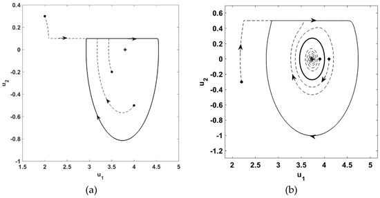Figure 8 shows the cases of a single equilibrium point. For relatively low belt velocity () the system yielded a spiral source (Figure 8a). The transient response is shown as dashed lines and the sustained oscillation as solid lines. Any initial condition, shown as dots, ended in the sustained stick-slip oscillation around the spiral. Figure 8b illustrates the phase plane for V = 0.5 where larger belt velocity resulted in Hopf-bifurcation, i.e., the spiral source transformed to a spiral sink, encircled by an unstable limit cycle shown using the thick line. Any initial condition grew or shrunk to the sustained stick-slip oscillation so long as it was outside the region enclosed by the limit cycle. An initial condition in the region within the limit cycle yielded an asymptotically stable system response, as shown in Figure 8b. The observed Hopf-bifurcation was consistent with that found in Refernce [24], wherein, it is shown to be the result of exponentially decaying friction coefficient.