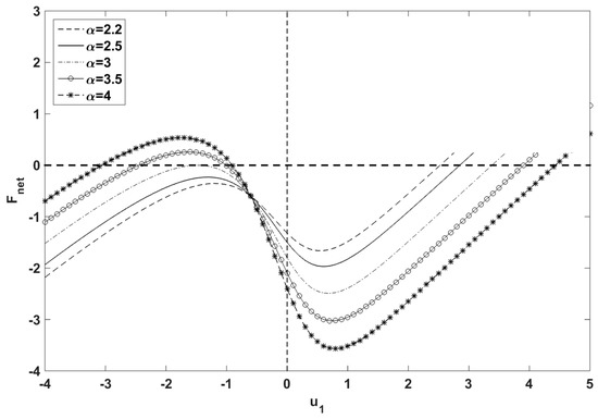 Numerical studies showed that no matter what the initial condition was, the oscillator was going to experience steady-state oscillation around the right-hand side equilibrium point. It should be noted that choosing a proper time-step was crucial to achieving correct numerical results, otherwise, incorrect trajectories showed up such as overshoot or steady-state stick-slip orbits around the left spiral. Therefore, it was necessary to verify the accuracy of the results. No matter where the oscillator stuck to the belt, it moved with the belt velocity as long as the friction force was less than its maximum static value. Stick to slip transition took places when friction force reached its maximum and either the tangential pushing or pulling elastic force overcame the static friction force. By assuming that the system was in stick phase ( and ), tangential net force () on the oscillator iwas plotted for a given set of parameters (Figure 9). As long as , it meant the elastic and damping forces were less than maximum friction force and the system kept stick phase. Stick to slip transition happens when , in other words, friction force reaches its maximum value [25]. For , the curve just crossed the thick horizontal dashed line one time () on the right-hand side of the right spiral (Figure 2c and Figure 9).