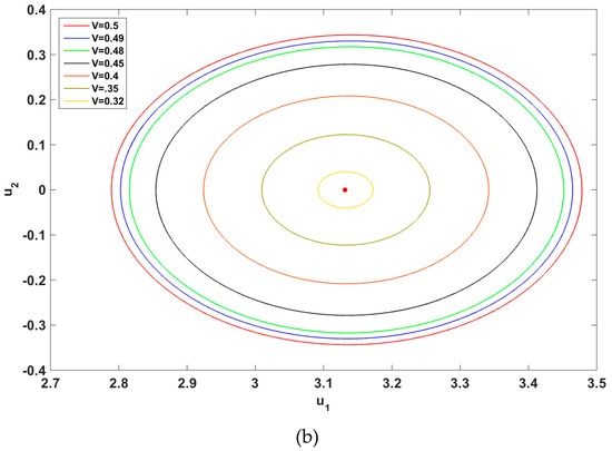 The unstable limit cycles which enclosed the spirals are shown in Figure 10. As it can be observed the amplitude of the both limit cycles decreased as the belt slowed down untiel the limit cycles vdanish and the origins became unstable, i.e., Hopf-bifurcation happened. The Hopf-bifurcation occured for the right spiral at , while the left one was still unstable (Figure 3 and Figure 10). Increasing the belt velocity to , both spirals experienced Hopf-bifurcation. Due to the complexity of the nonlinear equation of motion, numerical methods were employed to capture limit cycles. The existence of a limit cycle, locating it and investigating its existence have been widely discussed by researchers [27,28].