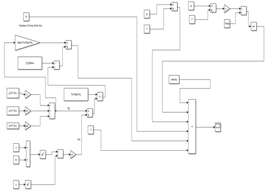 The MATLAB/Simulink model, based on the energy-harvesting equations, is attained as shown in Figure 1. The model starts with the equation of the cross-section area of the magnet. It requires the values of the diameter of the shaft and the width of the magnet. The second section is for finding the surface area of the cylindrical air gap, which requires the details of the length of the air gap between the piston rod and the permanent magnet array, magnet thickness, spacer thickness, the diameter of the shaft, and the width of the magnet. Furthermore, these findings are included in the equation of magnetic flux . Based on the above values, the MATLAB/Simulink model can predict the induced voltage .