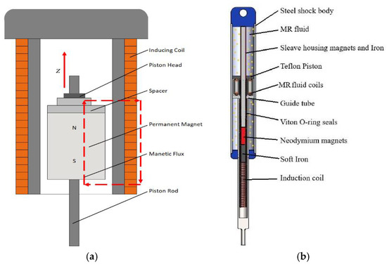 In recent years, there has been a growing interest in coupling the MR dampers with the energy-harvesting technologies [12,16,17]. Cho et al. proposed a special structure of an EMI device to be used with an MR damper [18]. They experimentally investigated a smart passive control system comprising an MR damper and an EMI device to generate electrical power [18]. Choi and Wereley studied the feasibility and effectiveness of a self-powered MR damper using a spring–mass EMI device [19]. Sapiński established a permanent magnet power generator for MR dampers; the designed vibration generator consisted of a special arrangement and a foil-wound coil, and the numerical analysis and experiment were carried out to investigate the magnetic field distribution and efficiency of the generator [20].