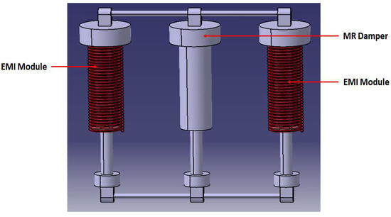 The CATIA V5 design modeling software program is used to model the proposed damper. Both the dampers on the side (energy harvesting module) consist of a copper generation coil and a neodymium N48 magnet inside. The schematic of the energy-harvesting module is shown in Figure 2a. Figure 2b shows the cross-sectional view of the MR damper. The energy-harvesting magnetorheological suspension prototype design in the parallel configuration is shown in Figure 3. The center damper has MR fluid inside it. Both the ends of MR damper and energy-harvesting modules are connected to the common beam. Therefore, any uneven profile coming from the bottom side can be equally distributed. The purpose of the MR damper is to damp the uneven vibrations. The EMI module generates energy, which can be further utilized for any other auxiliary systems.