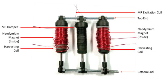 - In this study, an EHMR suspension system consisting of an MR damper and an energy-harvesting module in the parallel configuration is successfully designed and fabricated.