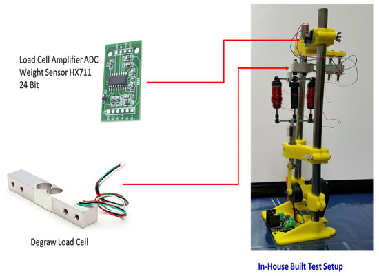 Figure 7 shows the load cell and load amplifier sensor used in the test setup. The load cell is made of aluminum alloy with the strain gauge pre-attached and strain-relieved wires. The range of the load cell is 0–5 kg. The dimensions of the load cell are 12.7 mm × 12.7 mm × 80 mm. There are four mounting holes, with 15 mm spacing on each side. On one side, both holes tapped M4 thread, on the other side both holes tapped M5 thread. The wire leads are 220 mm long.