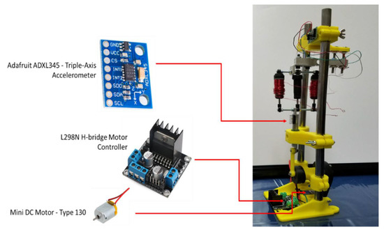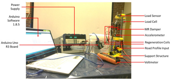 A Qunqi L298N Motor Drive Controller Board Module Dual H Bridge DC Stepper (Qunqi, Guangzhou, China) is used for stepper control of the DC Motor. A Mini DC Motor-Type 130 is used to provide vibration inputs. The operative voltage for the motor is DC 1.5 V to 6.0 V. An Arduino Uno R3 Microcontroller A000066 is used to receive and deliver the data to and from the sensors. The microcontroller is connected to a computer with the use of USB 2.0 to supply the input voltage to the board itself. Arduino 1.8.5 software is used to collect the measured values of damping force and velocity. The full in-house built setup consists of a power supply for the MR damper, a computer with the Arduino software program, load cell, load sensor, accelerometer, stepper controller, DC motor, voltmeter, and the assembly of the energy-harvesting magnetorheological damper in the parallel configuration, as shown in Figure 9.