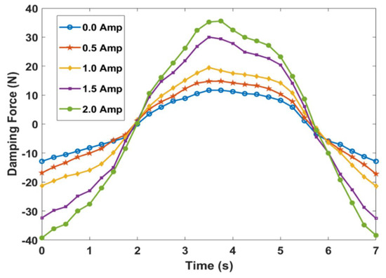 Figure 10 represents the comparison between the damping force at 0, 0.5, 1.0, 1.5, and 2.0 Amp current excitation with respect to time (s). The figure shows that the values of the damping force vary under various operating current ranges.