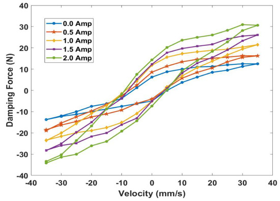 The damping force vs. velocity diagram decides the working ability of a damper. The force vs. velocity diagram shown in Figure 11 represents the damping coefficient value. Ideally, this graph should be on a linear slope. However, no system in the world is ideal or perfect. Therefore, any force vs. velocity diagram of the actual damper does not have a linear straight line curve. In the compression stroke, the velocity of the damper increases, which also causes an increment in the damping force. Meanwhile, during rebound, the stroke velocity and damping force decreases. The curve of the compression and rebound stroke does not follow the same path, and a loop is created. This loop is called a hysteresis loop. It can be seen from the graph that under various input currents, the loop curve changes. These data show that with the increase in current, the damping force increased as the fluid thickened. The highest force observed was 31 N for 2 A current.