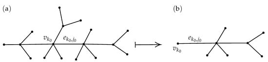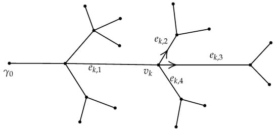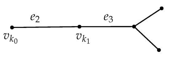 We now pose our inverse problem. Assume an observer knows the boundary condition (5), and that (6) holds at the other boundary vertices, and that the graph is a tree. The unknowns are the number of boundary vertices and interior vertices, the adjacency relations for this tree, i.e., for each pair of vertices, whether or not there is an edge joining them, the lengths , and the function q. We wish to determine these quantities with a set of measurements that we describe now. We can suppose is the interior vertex adjacent to with the edge joining the two, see Figure 1. Our first measurement is then the following measurement at :