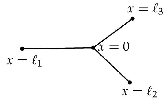 Consider a star shaped graph with edges . For each j, we identify with the interval and the central vertex with , see Figure 3.
