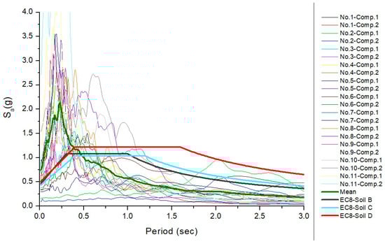 The set of long duration accelerograms used for the non-linear time-history analyses is shown in Table 4. In this table some details associated with the recorded accelerograms, i.e., the earthquake name, location, year and moment magnitude, are also provided. The two horizontal components of these accelerograms are applied to structural axes of Figure 2 with varying angle of seismic incidence θ, i.e., 0°, 45° and 90°. Thus, the number of nonlinear time-history analyses performed for each one of the steel buildings of Figure 1 is 99 (11 accelerograms × 3 values of θ × 3 base-soil conditions). The accelerograms of Table 4 have been taken from specific web sites of strong-motion data [30,31,32] and they have been used as-recorded (their baseline-corrected versions) in nonlinear time-history analyses, i.e., they were neither scaled nor matched to a design spectrum. The 5%-damped response spectra [2,33] of the two horizontal components of the accelerograms of Table 4 are shown in Figure 4. In that figure, the mean spectrum from the individual 5%-damped spectra as well as the design spectra of Eurocode 8 [2] for soil classes B, C, and D, are also provided for comparison purposes. It is stressed that the mean spectrum suppresses (as a result of averaging the dissimilar 5%-damped spectra) the real acceleration ordinates at periods >0.5 s and this effect should not be disregarded especially when SSI is to be evaluated.