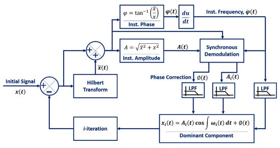 The amplitude, , and phase shift, , after the demodulation process can be estimated from Equations (1) and (2) using the same techniques as shown in Figure 1. The phase shift correction is important to make the decomposed signal in-phase with the initial or the reference signal. Therefore, only the out of phase signal remains after the subtraction process. The procedure is repeated for an arbitrary number of iterations.