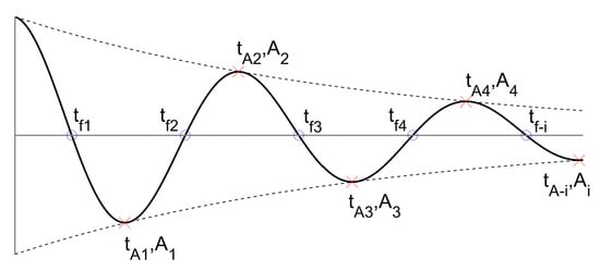 The instantaneous amplitude can be observed by tracing the local minima or maxima from each zero-crossing point of the transient response as indicated by the red cross markers in Figure 2. Since the frequency is calculated based on one cycle of the curve, the number of the instantaneous frequency data would be equal to that of the instantaneous amplitude, . Therefore, the backbone curve can be compiled by pairing these data.