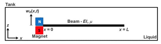 The system under consideration is illustrated in Figure 3, where and define the physical coordinate system. The beam is coupled with a permanent magnet at one side and free at the other end. The magnet is used to either attract or repel the magnetic fields induced by an electromagnet situated around the structure, inducing a periodic oscillation in the transverse direction. The beam is composed of a uniform steel alloy material which has a density and modulus of elasticity of 7200 kg/m3 and 240 GPa, respectively. The beam has a rectangular geometry, 80 × 12.75 mm, with a thickness of 0.08 mm. The analysis is carried out in two different fluid media, namely air and water. Thus, the terms “dry” and “wet” will be used here to represent the beam in air and liquid environments, respectively. The air and water density are 1.26 kg/m3 and 997 kg/m3, respectively.
