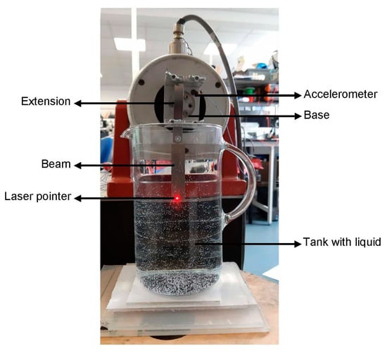 To create an equivalent model of Figure 3, the beam, shown in Figure 4, is clamped on an LDS V406 permanent magnet shaker to induce vibrations in the structure. A rigid extension is used to fully immerse the beam in water and reproduce the rigid body movement of the magnet illustrated in Figure 3. The velocity response of the beam is acquired from a single-pointer Polytech laser vibrometer PDV-100, while the base acceleration, , is measured by an accelerometer. For the purpose of this experiment, the extension can be considered rigid, i.e., its lowest natural frequency occurs far from the frequency range of interest. Figure 4 shows the experimental setup for the beam in the wet condition, whereas, in the dry condition, the tank is simply removed.
