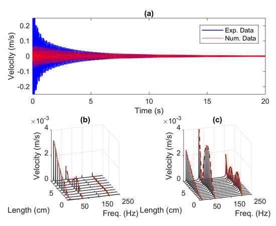 The first test for the wet model was carried out using the step function input signal. Figure 9a shows the time series of the velocity response obtained at the tip of the beam. The results show a satisfactory performance of the numerical model in order to replicate the response of the experimental model, albeit with less oscillation. The frequency responses reveal that the three modes of the experimental model appear just under 60 Hz as shown in Figure 9b. On the other hand, the only obvious peak in the numerical model shown in Figure 9c is the first mode marked with the continuous red line over the peaks along the beam length. The second and third modes exhibit highly damped characteristics indicated with a rounded peak. There is no clear peak particularly in the third mode which are hard to detect using standard algorithm to extract the local maxima. However, it can be seen from visual observation that the patterns around 20 Hz and 60 Hz form the mode shapes of the second and third resonant frequencies.