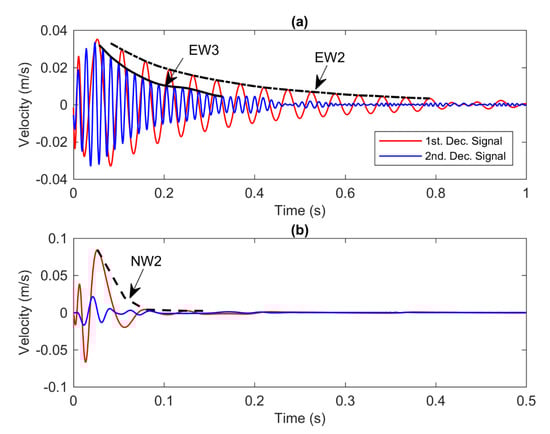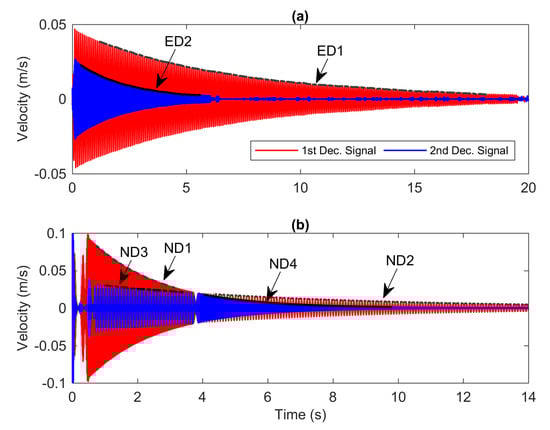 To examine the nonlinearity in each mode, the time series of velocity shown in Figure 5a is decomposed using the wave separation technique presented in Section 2.1 to extract the first and second modes. The third mode is not taken into account since it has very little contribution in the experimental model. Therefore, there are only two iterations in the block diagram of the HVD procedure as illustrated in Figure 1. Figure 6a,b present the decomposed signals for the experimental and numerical models, respectively. The red and blue colours from both figures signify the first and second decomposed signals, respectively. The notations ED1, ED2, ND1, ND2, ND3 and ND4 represent the instantaneous amplitudes of the experimental (ED) and numerical data (ND). It is seen from the figures that the amplitude of the decay response can be associated with the mode contributions in the frequency domain of the initial signal. For instance, the initial amplitudes of the first and second decomposed signals of the experimental model shown in Figure 6a have the same proportion as the peaks of the initial signal in the frequency domain. In Figure 6b, interestingly, there are two distinct decay rates and frequencies in one signal. We can assume that ND2 and ND3 have similar instantaneous frequency properties and demonstrate very slow decaying rate compared to that of ND1 and ND4. The distinction in the decay rate is of course due to the assumption that the damping ratio for the first mode is set to a higher value than for the second mode.