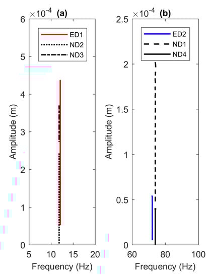 The time series of velocity shown in Figure 6 is integrated numerically to obtain the relative displacement of the beam. Using the nonlinear identification method to extract the instantaneous amplitude and frequency presented above, the backbone curves for the first and second mode are depicted in Figure 7a,b. From the figures, the backbone curves indicated with the legends ED1—ND4 are extracted from the instantaneous amplitudes shown in Figure 6. The instantaneous frequencies however are not shown here for brevity. The backbone diagrams exhibit a straight-line indicating that the system behaves linearly. The difference between the estimated frequency values between the experimental and numerical models can be related to the filtering process in the HVD procedure to smooth out the analytical signal, the instantaneous vibration properties and the demodulation process. Nevertheless, the disparity between the two models are insignificant with errors less than 3% for the two modes.