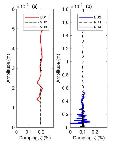 Figure 8a,b display the damping curve with respect to the displacement amplitude. As expected, the experimental and numerical models exhibit linear damping characteristics. The damping curves of the experimental and numerical results coincide with each other and agree with the initial assumption of 0.2% and 0.1% damping ratio for the first and second modes, respectively. The presence of noise in the second mode of the experimental model is due to rapid decay time of this mode. It is worth noting that the purpose of the dry model analysis is not only for characterising the beam in air, but also to prove that the procedures for identifying the nonlinear system are correct.