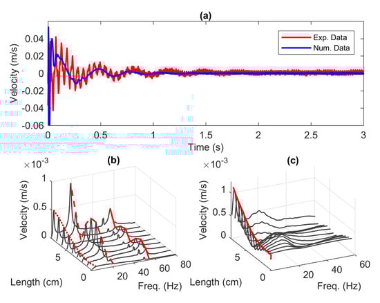 By implementing the Fast Fourier transform (FFT), the frequency responses are depicted in Figure 5b,c for various locations along the length of the beam. From the figures, the red lines over the local maxima (peaks) represent the first, second and third mode shapes of the beam. Note that the peaks appeared at 150 Hz as well as 200 Hz in the experiment data shown in Figure 5b are the aliasing errors. It can be seen from Figure 5b,c that the two models have different mode contributions. The numerical model has equal first and second mode contributions, while the first mode contributes the most in the experiment model. This occurrence can be related to the structure of the clamped section of the beam depicted in Figure 4. The beam is mounted on the moving part of the shaker where this element is held up by a flexible support that acts like a spring [27]. Therefore, there is a possibility that the moving part of the shaker absorbs vibrations. We also noticed from physical observations that, before the base of the shaker reaches the steady state, it goes through an overshoot followed by a small oscillation in response to the step input signal. This phenomenon, however, will be investigated in detail in the next section.