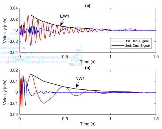 Figure 10a,b depict the decomposed signals of the experimental and numerical models, respectively. From both figures, only the first decomposition signals indicated with the red lines provide very apparent decaying oscillations. The envelopes over the decay signals denoted with “EW1” and “NW1” signify the instantaneous amplitude of the experiment and numerical models respectively. The envelope is chosen such that it is favourable for nonlinear identification analysis. It is reasonable to assume that EW1 corresponds to the contribution of the second mode of the experimental model, while NW1 is under the influence of the first mode of the numerical model. The identification process for the numerical model becomes challenging since the envelope of NW1 contains a short time period signal where the amplitude tends to decay very quickly. Consequently, the instantaneous amplitude is comprised of a very few data points from several peaks for nonlinear analysis.