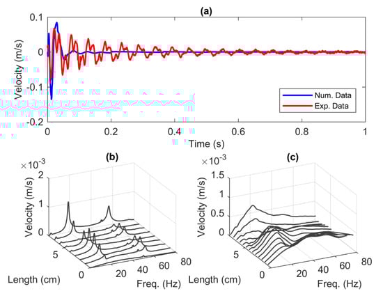 (a) The time series of velocity at = 8 cm, and the 3D plot of velocity in various frequency and beam length of (b) the experimental model and (c) the numerical model.