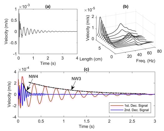 Figure 13a shows the time series of velocity generated using the step input with the base amplitude of 0.01 mm. It is seen that the response undeniably oscillates for 4 s. The frequency response shown in Figure 13b unveils that the second mode becomes prominent compared to that of the frequency response in Figure 9c. Interestingly, the value of the second mode moves away from the origin and becomes less important compared to that of the experiment model. Figure 13c exhibits the two separated signals using the signal separation presented in Section 2. The first decomposed signal, indicated with the red line, has a pronounced envelope, NW3, with slow-varying amplitude over the period of time.