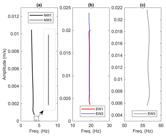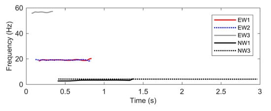 Figure 14 depicts the time series of the instantaneous frequency extracted from the decay responses of the envelopes EW1, EW2, EW3, NW1 and NW3. From the figures, all models agree that there is no sign of nonlinearity as demonstrated by the unchanging frequency over time. The backbone curves are constructed by pairing those instantaneous frequencies with the instantaneous amplitudes as illustrated in Figure 15. Note that the line NW1 shown in Figure 15a is formed with fewer data points which create bias in the straight line. In addition, the line EW3 shown in Figure 15c is also extracted from the noisy signal of the third mode. Consequently, an arbitrary 5 point moving average filter is applied to smooth out the line where the mean is calculated based on the current point, 5 elements backward and 5 elements forward.