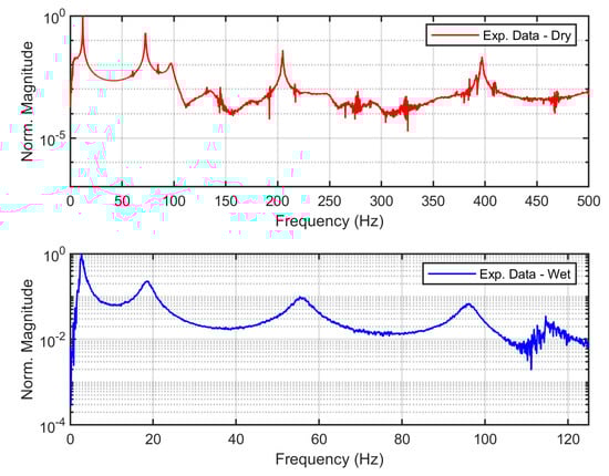 The natural frequencies are important characteristics where an error from this estimation would create discrepancies in all analyses. To extract natural frequencies of the beam from experiment, the shaker is driven by a random input signal from a signal generator. Both the signal generator and the signal analyser are provided by SignalCalc Ace powered by the Quattro hardware platform. The output signal from Quattro is amplified by an amplifier provided by LDS PA25E to meet the power required by the shaker. The output voltages from the laser vibrometer and accelerometer are connected to a signal analyser to estimate the frequency response function (FRF) using the fast Fourier transform (FFT) spectrum analysis. Thus, the FRF is the magnitude of the transfer function of the beam velocity from the laser vibrometer relative to the base acceleration. Figure 17 shows the FRF for the dry and wet models indicated with the red and blue lines, respectively.
