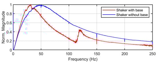 To investigate these phenomena, the FRF tests were conducted by measuring the base velocity to the input signal from the signal generator as shown in Figure 18. The first test indicated with the blue line was performed with the shaker in the unloaded condition (without the base), while the second test, the red line, was carried out with the beam and its base mounted on the shaker. Thus, the normalised magnitude in Figure 18 represents the transfer function of the base acceleration of the shaker relative to the signal generator with respect to frequency. It is seen from the figure that the natural frequency of the shaker appears around 47 Hz for the unloaded condition, while the peak displaces to 30 Hz due to the additional masses from the base, extension and beam on the shaker. The presence of this peak is due to the design of the shaker that uses spring components to hold the moving part [42,43]. Consequently, it tends to move the modes of the beam away from its origin, resulting in a noticeable error in the validation [44].