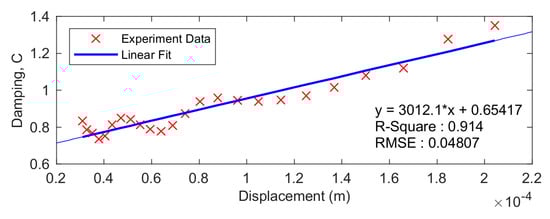The result from Equation (25) is then plotted with respect to the displacement amplitude as presented in Figure 19. From the figure, the blue line from the figure shows the curve fitting of the experiment data to the first degree polynomial. It is seen from the figure that the linear regression generates a satisfactory fit indicated with the R-Square of 91.4%. Therefore, the constant and can be obtained by using the linear equation shown in Figure 19 which gives and . Following the procedure presented in [14,21], the quadratic damping values are estimated by