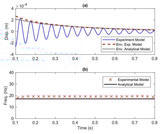 To obtain the dynamics of the responses of the beam, the damping coefficients from the fitting process are preferred to Equation (20). Figure 20a depicts the comparison of the instantaneous amplitude of the analytical model compared to that of the experimental model. It is seen from the figure that the envelope of the analytical model is capable of tracking the peaks of the experiment model over time. Figure 20b displays the time series of the instantaneous frequency for both the analytical and experiment models. The cause of the discrepancy between the two models was discussed in detail in the validation of natural frequencies, Section 5.2.