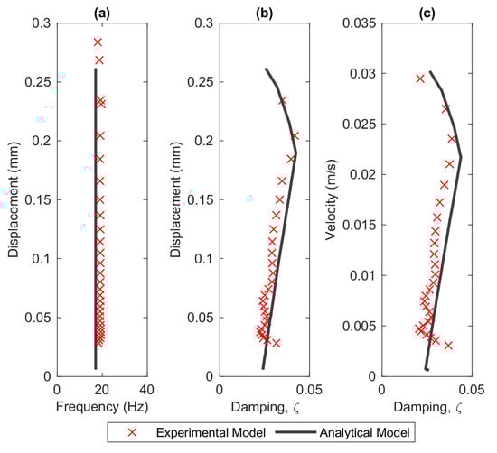 By pairing the instantaneous amplitude with the instantaneous frequency, the backbone curve can be constructed as illustrated in Figure 21a. The damping curves with respect to displacement and velocity amplitudes are depicted in Figure 21b,c, respectively. Overall, the analytical model can produce good agreement for predicting the dynamic behaviour of the structure in a fluid environment. One might expect the damping curves from the analytical model pass through the experimental data as illustrated in Figure 19. This is unlikely to occur due to the discrepancy in the natural frequencies between the two models where the damping ratio is inversely proportional to the resonant frequency based on Equation (25).