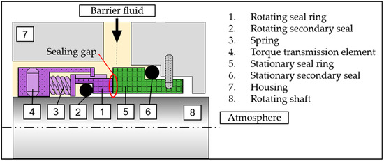 Schematic illustration of the main components of an exemplary mechanical seal. The rotating sealing unit is marked purple and the stationary sealing unit is marked green.