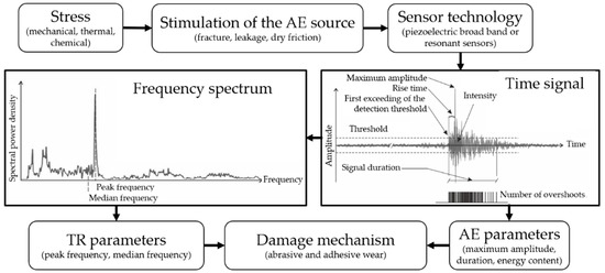 To prevent the recording of disturbing background noises, a threshold filter is typically used whereby only AE with higher amplitudes are recorded. The threshold can be user-adjustable, fixed or automatically adjustable. The recording of the signal starts when the amplitude of a hit exceeds the threshold level and ends when it falls below the threshold again. The waveform is then used to determine the so-called AE parameters (see Figure 4), such as the maximum amplitude or the hit duration. Utilizing a fast Fourier transformation (FFT), the spectrum of the signal can be determined, which can then be used to create additional parameters including the peak or median frequency; these are known as transient parameters (TR parameters) [20]. In non-destructive testing, different damage generation mechanisms can be distinguished using these parameter sets. The amplitudes of the AE signals are given in decibel AE (dBAE) with a reference voltage of 1 µV [21]. Figure 4 shows a summary of the signal processing of AE measurements.