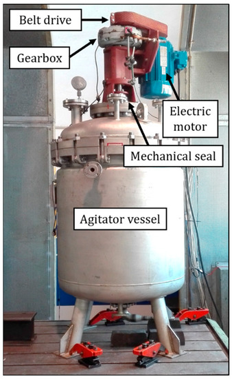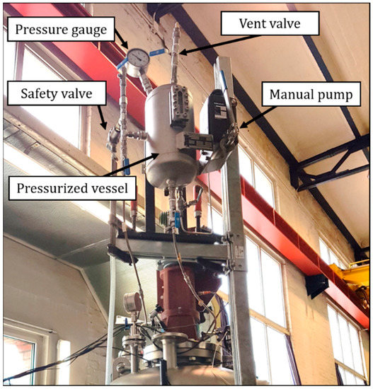 Furthermore, the mechanical seal of the agitator vessel system was equipped with a thermosyphon-type barrier fluid system. Additionally, a pressurized vessel with variable pressure between 0 and 10 bar was installed. White mineral oil and demineralized water were used as barrier fluids. Figure 5 shows the agitator vessel system assembly and Figure 6 the barrier fluid system.