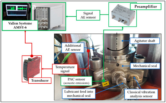 The WD sensor from the physical acoustics corporation (PAC) with an operating frequency range from 125 kHz to 1 MHz was employed in a radial position to obtain the AE signals. These were amplified by 34 dBAE with the AEP3N preamplifier from Vallen Systeme GmbH. The sampling frequency was 2.5 MHz and the maximum number of samples per set was 262.144. The Vallen VisualAE software from Vallen Systeme GmbH was used to visualize the data. The Korasilon Paste M-S 2-200 from Kurt Obermeier GmbH (Bad Berleburg, Germany) was used as a coupling agent for the sensor. For test rig monitoring purposes, one additional AE sensor and one sensor from the classical vibration analyses, which can be seen in Figure 7. AMSY-6 measuring system setup on the double-acting mechanical seal, were also installed. The experimental setup is shown in Figure 7.