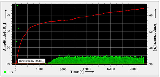 The upper diagram in Figure 11 shows the accumulation of the previously detected hits, which is represented by the green line corresponding to the left y-axis. The height of the green bars in the lower diagram represents the number of hits that occurred over the course of the previous 30 s. In both diagrams, the red line corresponds to the temperature measurement. Furthermore, all hits considered in Figure 11 had amplitude values greater than 50 dBAE.